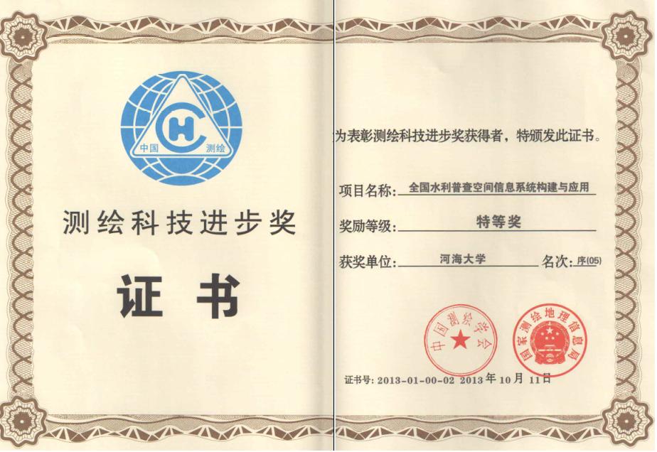 “全国水利普查空间信息系统构建与应用”获2013年测绘科技进步奖特等奖