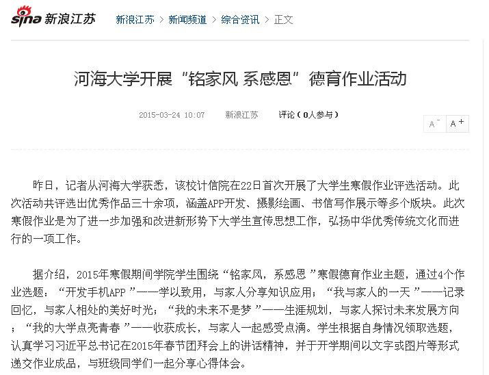 近年来,学院立足专业特色与优势,推进思想政治教育工作新模式,2015年寒假,给学生布置了主题为“铭家风,系感恩”的寒假德育作业,用现代科技平台弘扬与宣传中华优秀传统文化,意义深刻,影响深远。