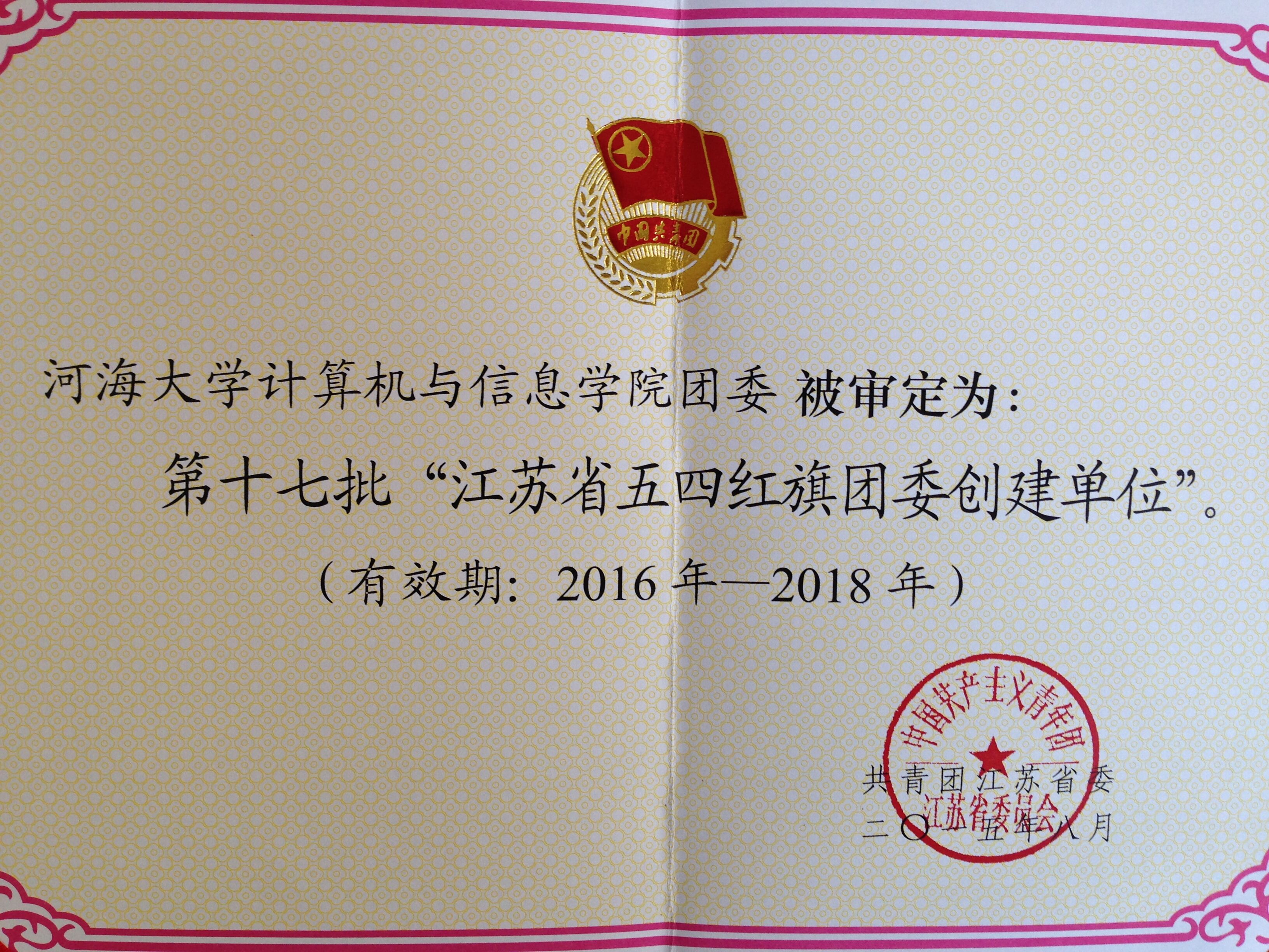 团委被审定为第十七批“江苏省五四红旗团委创建单位”,通过“五四红旗团委创建单位”的创建才能申报“江苏省五四红旗团委”。