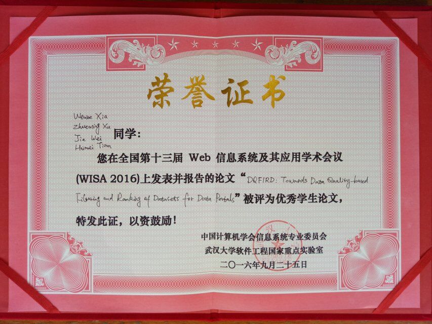 由中国计算机学会(暨信息系统专业委员会)和IEEE Reliability Society共同主办、武汉大学承办、华中科技大学等单位协办的第十三届全国Web信息系统及其应用学术会议(13th Web Information System and Application Conference, WISA 2016)于2016年9月23-25日在湖北武汉成功举行。人体艺术 许卓明教授及其研究生参加了本届(WISA 2016)学术会议,并再次在WISA学术会议上荣获“优秀学生论文”奖。本次获奖论文是计算机科学与技术专业2014级硕士研究生夏文泽同学为第一作者的英文学术论文《DQFIRD: Towards Data Quality-based Filtering and Ranking of Datasets for Data Portals》。该论文由IEEE Press出版,将被EI检索。