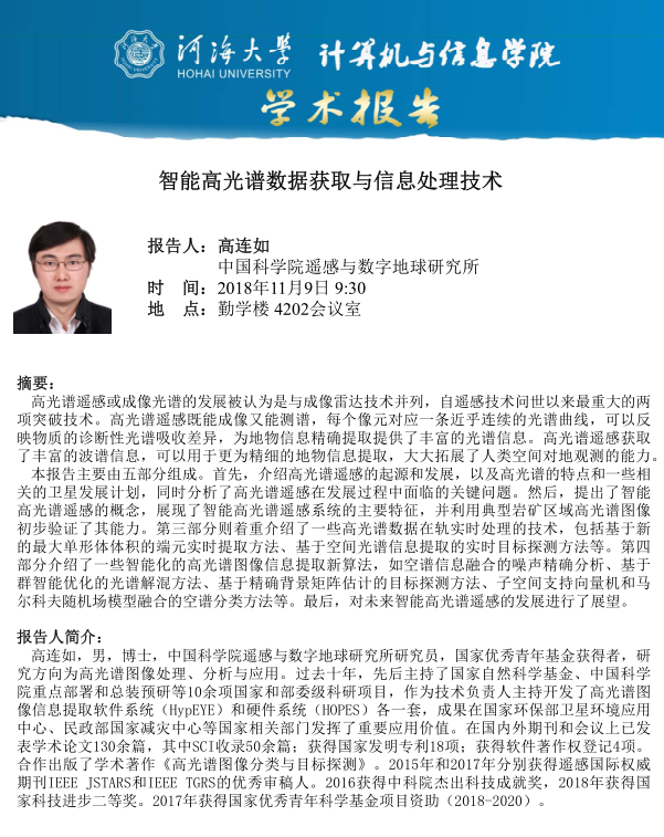 学术报告:智能高光谱数据获取与信息处理技术