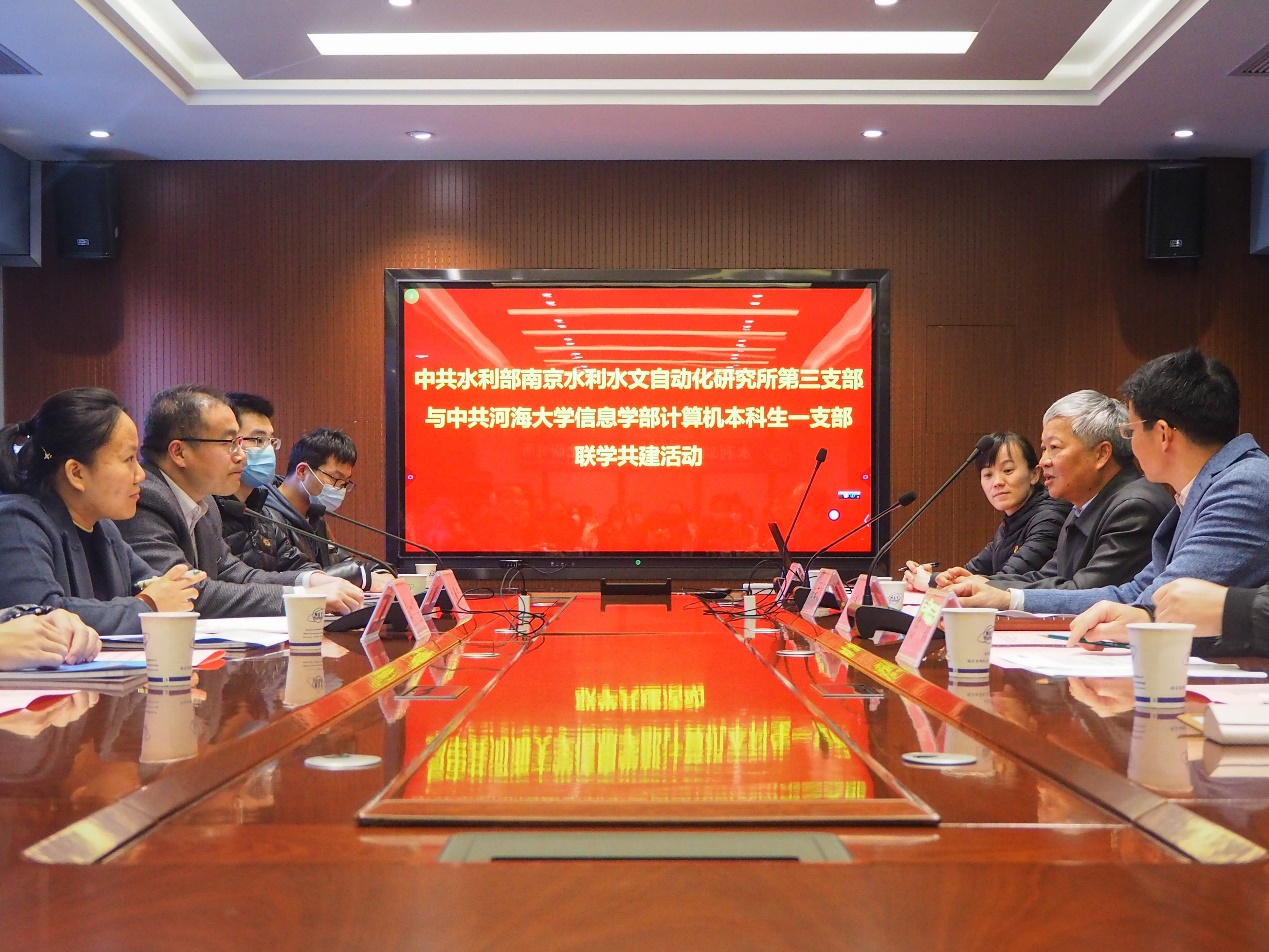 南京水利水文自动化研究所党委副书记陆云扬对刘春田副书记一行的到来表示热烈欢迎,并对支部联学共建的主题和形式给予充分肯定。陆云扬副书记简要介绍了水利水文自动化研究所的悠久历史、发展现状及未来规划等,同时希望两个支部努力实现联学共建、联学育人、联学发展。信息学部党委副书记刘春田向与会人员介绍了学校及学部基本情况和发展愿景,指出基层支部的联学共建活动是双方巩固深化校所、院所合作关系的重要契机,有助于实现组织共建、活动共商、资源共享、成果共用,能够把双方党支部的政治优势更好地转化为发展优势,更好地做到促进院所双方共同发展。