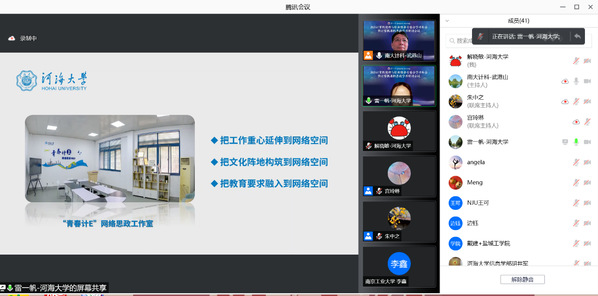 计信院本科生辅导员雷一帆以《思政培根铸魂,网络创新领航》为题,从把握思政工作主旨、搭建网络育人平台、创新思政教育实践三个方面,就学院“青春计E”网络思政工作室的建设与成效与参会人员进行了交流。江苏省计算机学会法人、计算机伦理与职业修养专委会主任、南京大学计算机学院党委书记武港山充分肯定了人体艺术 在网络育人方面的实践,尤其是“青春计E”网络思政工作室平台的建设,其做法对高校网络育人的实施有较强启发意义。