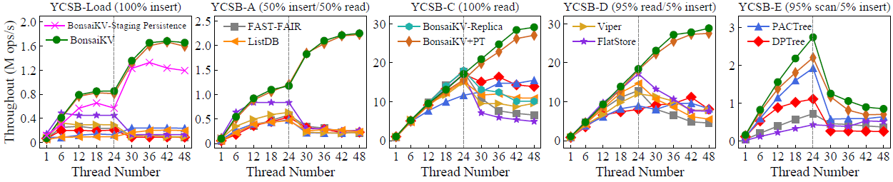 论文实验采用雅虎公司的标准云服务基准测试工具YCSB,对比六种之前研究工作中提出内存键值存储系统,BonsaiKV在数据索引效率、数据读写吞吐量、跨内存节点访问延迟等方面最高有近20倍的性能提升。