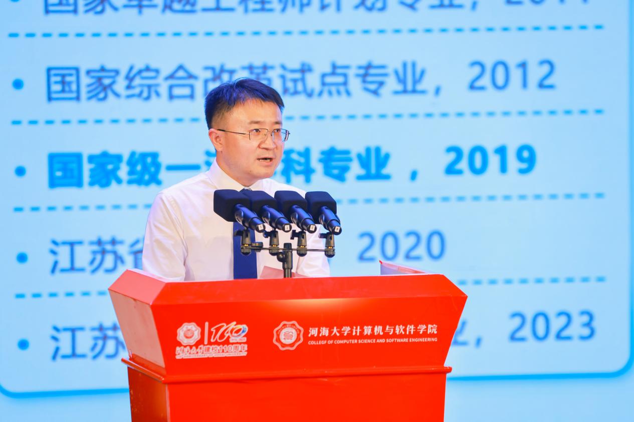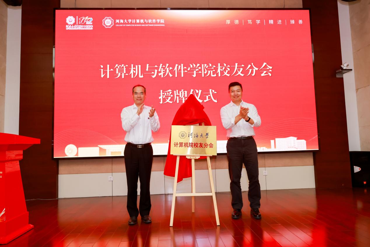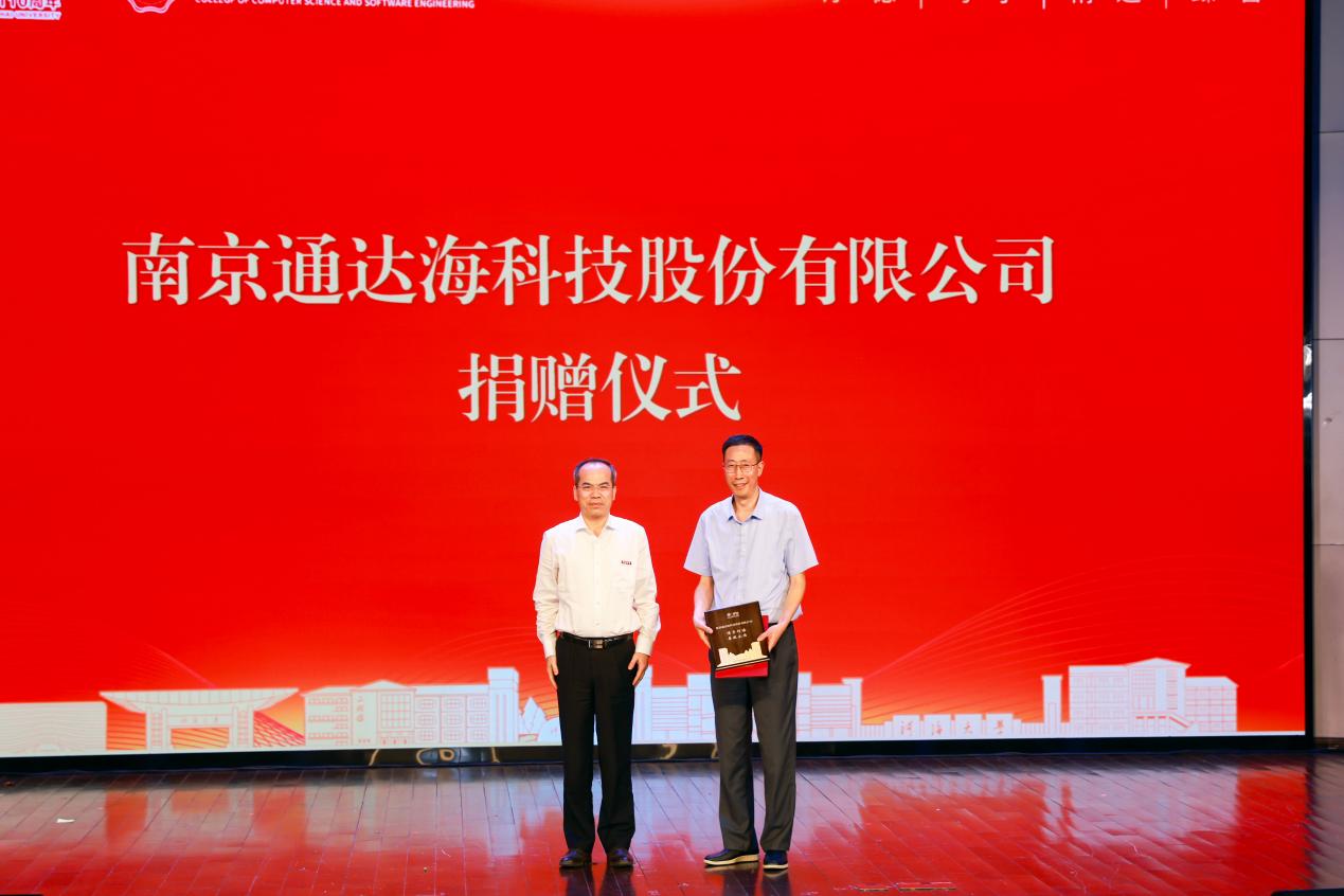 郑金海校长向南京通达海股份有限公司郑建国董事长颁发捐赠证书和鸣谢牌,郑建国董事长代表公司捐赠300万元用于学生培养、创新创业等。现场还举行了学院与中兴、长委网信中心、黄委信息中心、南京水科院等十家合作单位的产教深度融合联盟启动仪式。