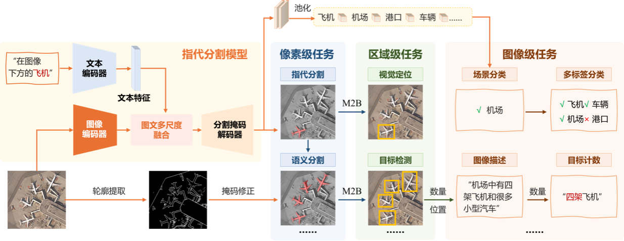 为解决遥感难以兼容多种视觉任务的问题,团队研发了统一多视觉任务的轻量型感知模型RemoteSAM,在一个模型中同时支持分类、检测、分割和定位等8种遥感任务。不同于以往依赖特定任务头微调或基于大语言模型的文本生成范式,该研究提出了一种以“指代分割”任务为核心的统一架构。模型以像素级掩码作为基础计算单元,能够无缝转换为检测框、类别标签或计数结果。RemoteSAM以更小的参数量(180M)在多个基准测试中超越了Falcon、GeoChat等七十亿(7B)参数级模型,实现了高效、高精度的统一感知。
