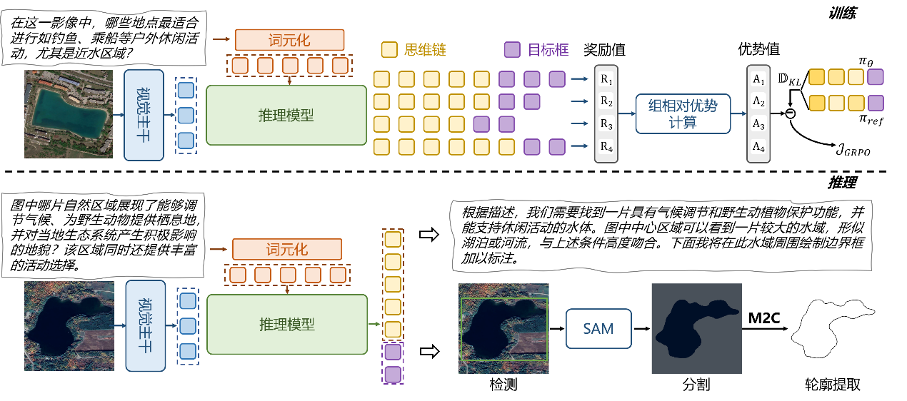 针对遥感解译中用户意图模糊、地理空间关系复杂的难题,团队提出了首个强化学习驱动的地理空间推理模型RemoteReasoner。该研究打破了传统监督微调的限制,首次引入群组相对策略优化算法进行强化学习训练,赋予了模型自主探索推理路径的能力,仅需一次推理即可同时支持区域级、像素级和目标级的多粒度推理任务。RemoteReasoner在区域级推理任务上超越现有模型精度34%,并在未见过的任务和类别上展现了卓越的泛化能力。